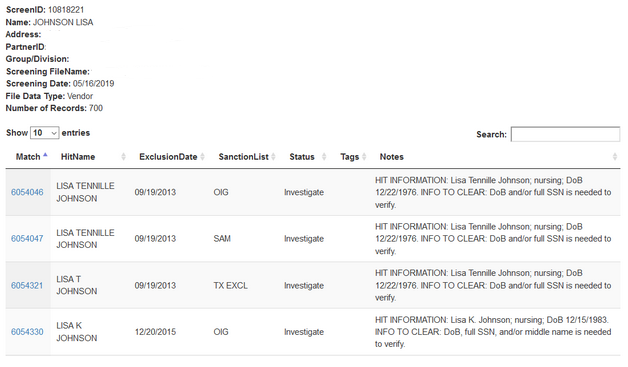 Each Screen Details displays, by unique Screen ID, ONE name, as submitted by the client, along with all the name matches that are under investigation for that screened name.