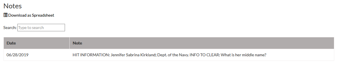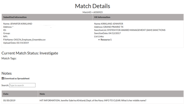 On the bottom of the Match Details page, you will see the OIGCN investigator’s notes which provide more details about the hit name and sanction, along with information needed that we can use to clear or confirm the name match.