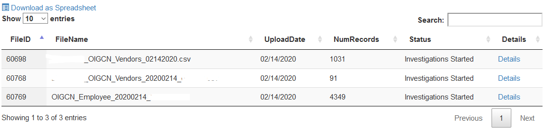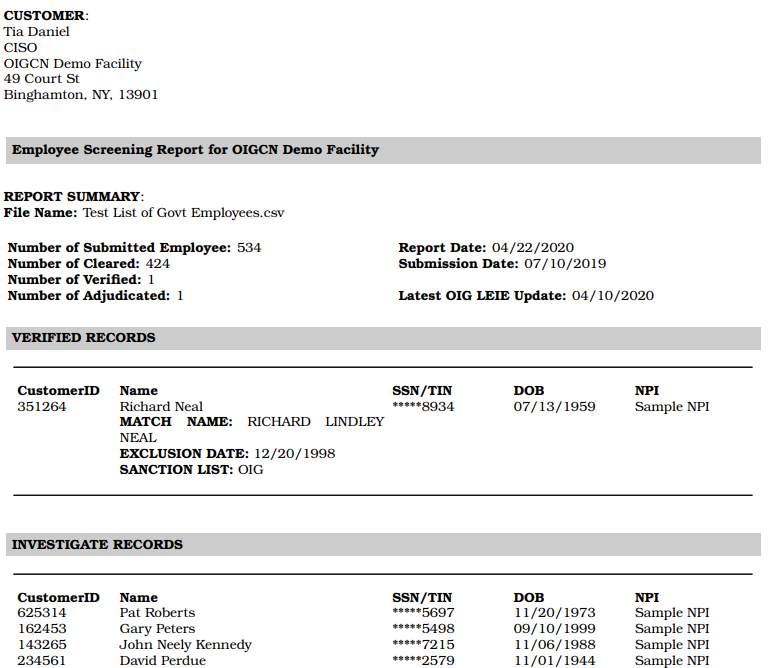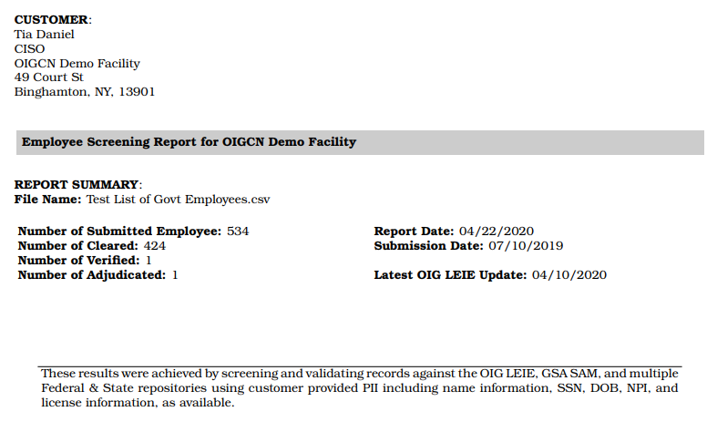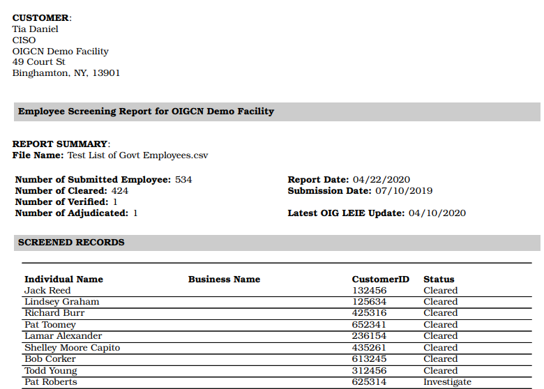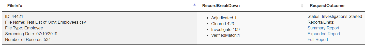- Full Report - Includes all information of Summary report but also includes all of the submitted names and the screening status of each.