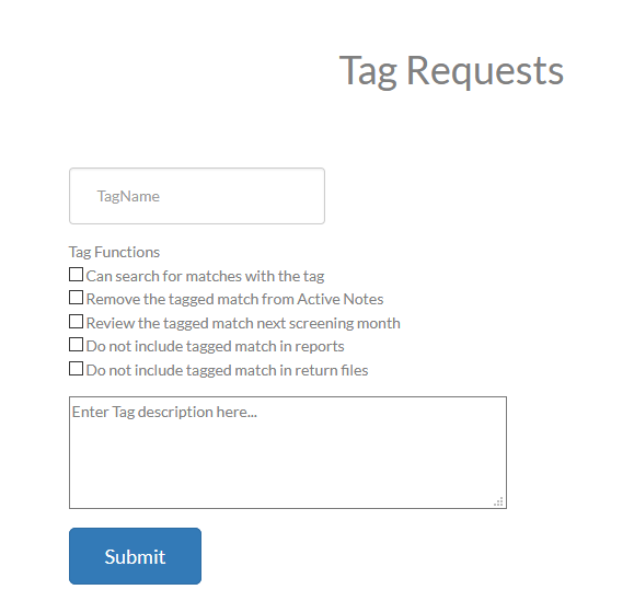 | Review the tagged match during the next screening month | This tag will cause the match to appear in Active Notes during the next month’s screening so the match can be reviewed. |